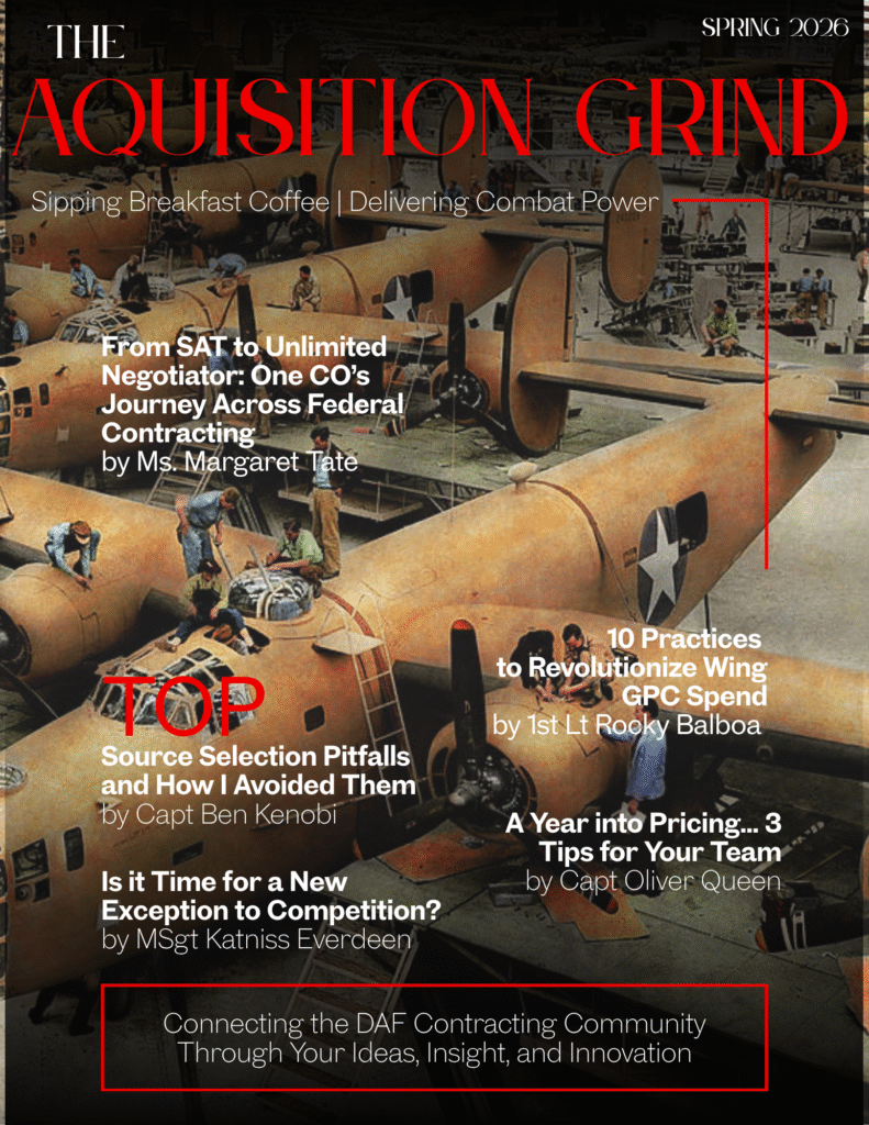 Acquisition Grind is a professional journal by and for Department of the Air Force contracting professionals. Founded to connect the contracting community through ideas, insight, issues, and lessons learned, this publication highlights the people and practices behind the mission at every level and rank, from operational buyers to senior leaders.
